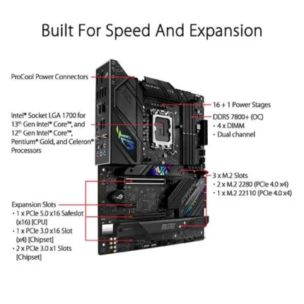 The Strix Z790-H adds PCIe 5.0 support to its arsenal with an x16 expansion slot that’s protected with a SafeSlot retention bracket to bear the weight of the latest graphics cards.